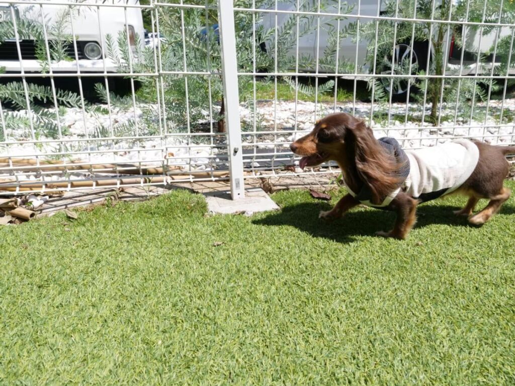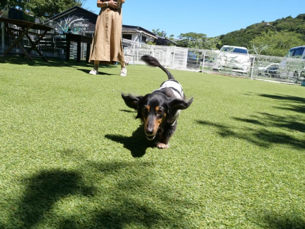 さらに、敷地内にはドッグランも併設されています。利用はスタッフさんに声をかけて案内してもらうスタイルでした。プライベート感のある区画で、他の犬と鉢合わせしにくい作りになっているようです。