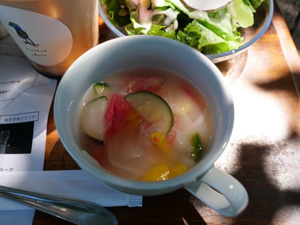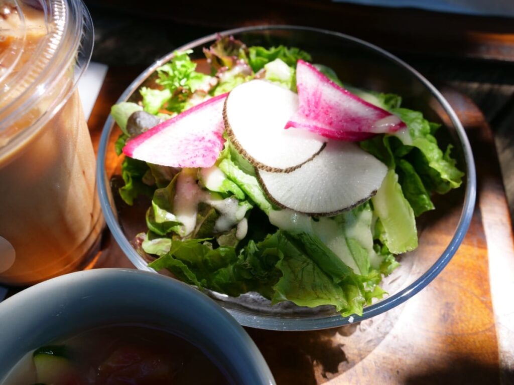 スープはやさしい味わいで、野菜もたっぷり入っていました。サラダはシャキッとした食感で、しらす丼の合間に食べるとちょうどよく口がさっぱりします。セット全体のバランスが良く、最後まで飽きずに食べられました。