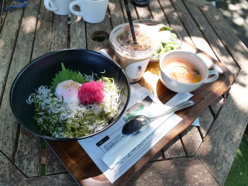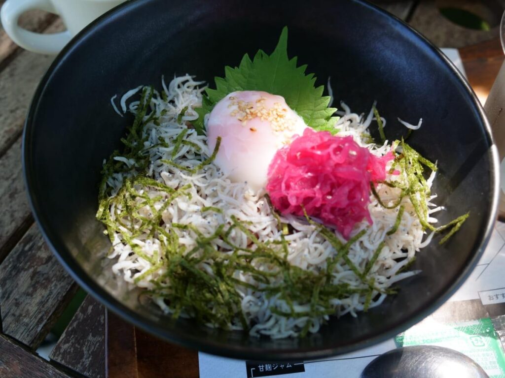 メインのしらす丼は、地元・秋谷産のしらすを使ったもの。たっぷり乗ったしらすと海苔の香りが合わさって、見ているだけでテンションが上がります。温泉卵を崩して全体に絡めると、味がまとまって一気においしくなりました。せっかくこのエリアに来たなら、しらす丼は外せないと思います。