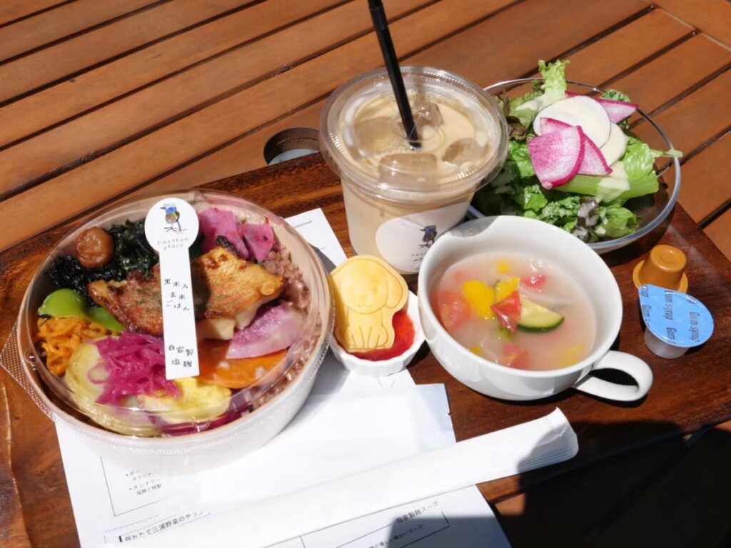 テーブルに並べると、ドリンク、スープ、サラダも付いてなかなかのボリューム感でした。外で食べると不思議と何でもおいしく感じるのですが、この日もそれを実感しました。